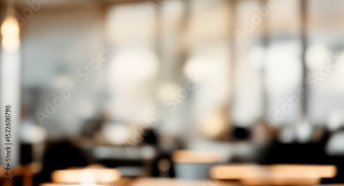 Blurred interior view of a cafe or restaurant with tables and chairs with a cozy ambiance, modern furnishings, and soft warm lighting in a relaxed urban setting.