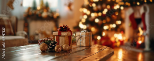 Blurred living room with Christmas tree and fireplace, many gifts on the table, New Year background with blur effect and warm golden tones, Photo with free space for text, with bokeh effect