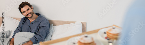 blurred man holding breakfast tray with pancakes near happy boyfriend in bed, banner