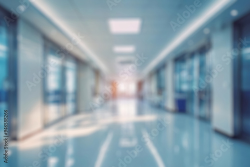 blurred of background. interior of a modern hospital with an empty long corridor. waiting room for patients and families between the corridor with bright white lights. treatment rooms and patient room