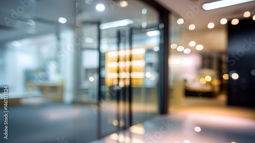 Blurred office interior background with glass door modern workspace professional environment focused view