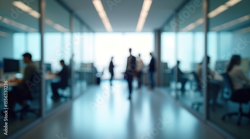Blurred Office Scene Modern Workspace with People Working and Walking Creating an Atmospheric and Energetic Vibe