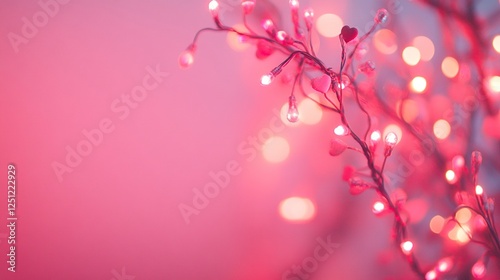 blurred pink background with small glowing hearts for valentine's day. soft bokeh effect. valentines abstract backdrop with defocused lights in heart shape. banner template, stock photo