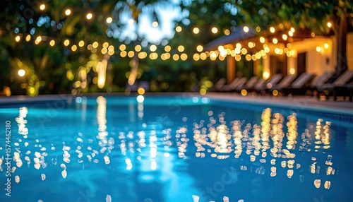 pool, twilight, light, blurred, patio, evening, tropical, vacation, resort, relaxation, water, string, tree, house, night, relaxing, warm, calm, poolside, ambience, leisure, outdoors