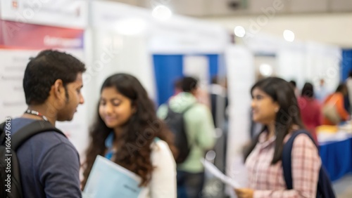 Blurred Portrait of Indian Students Engaging with Recruiters at Career Fair Booths