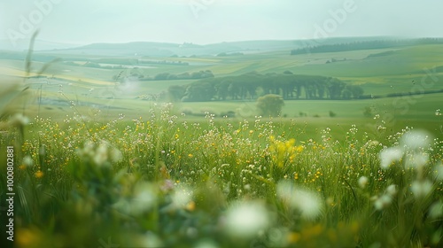 Blurry countryside scene with rolling hills wildflowers and a clear sky