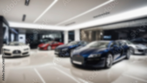 Blurry image of a luxury car showroom in a modern room, cars are lined up neatly ready for sale, blurry wallpaper.