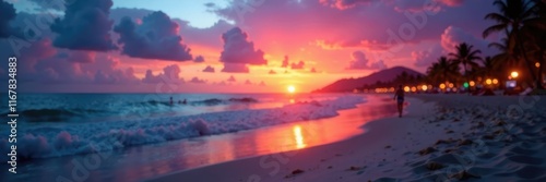 Blurry sunset, beach resort ambiance, fairy lights glow, sea, golden, bokeh