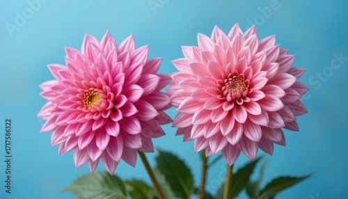 “Blush in Bloom: Stunning Pink Dahlias Unfold Their Petals Against a Creative Blue Backdrop, Blending Vibrant Elegance and Artistic Charm in a Captivating Floral Display.”
