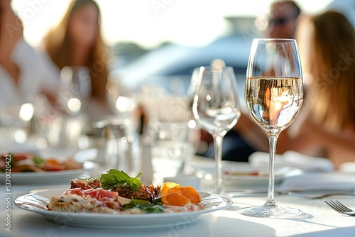 Boat Dining: Guests enjoying a gourmet meal on a luxury yacht.