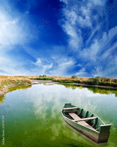 boat, wooden, fish, elegant, small, sky, bright, blue, cloud, celestial, wanderer, cloudscape, cloudy, water, river, lake, duck pond, puddle, reservoir, calm, mirror, summer, season, warm, warmth, day, landscape, scene, panoramic, nature, vacation, hot, glow, heat, beautiful, magnificent, marvellously, beauty