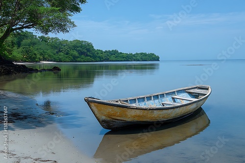 boat, water, sea, ocean, shore, beach, tropical, landscape, coast, coastline, sand, sky, blue, calm, nature, travel, vacation, paradise, island, lagoon, idylli, peaceful, serene, sunlight, shadow, tree, green, foliage, plant, vegetation, tranquil, seascape, summer, destination, get-away, scenic