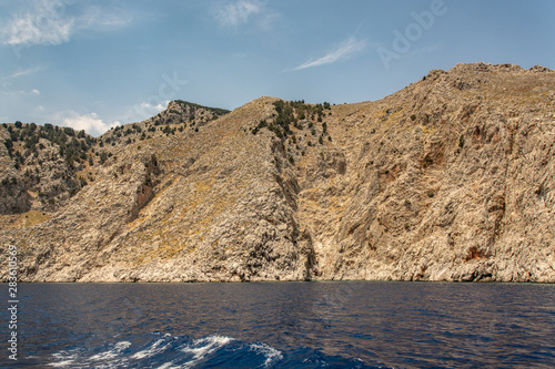 greece, sea, mountain, rock, peak, bay, ship, stone, beach, recreation, high, infused, walk, nature, foam, footprint, wave, water, tree, bush, grass, sand, cave, ravine, excursion, vegetation, scarce, summer, heat, sun, travel, impression, cruise, yacht, blue, green, white, lens flare, mood, tour tourism