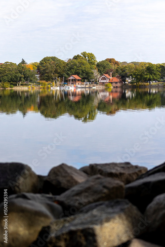 Boathouses and Sailboats Reflected in Still Water on a Calm Autumn Day