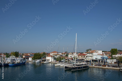 Boats at the port of village of Keramoti, Greece. Thasos island harbor, beautiful blue water and sky, tavernas, café and restaurants, travel destination