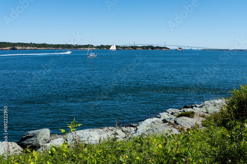 horizontal, rocky, coastline, bush, blue, green, landscape, outdoors, day, nobody, scenic, nature, travel, vacation, tour tourism, sea, sky, atlantic ocean, rhode island, new england, us, sailboat, bridge, motorboat