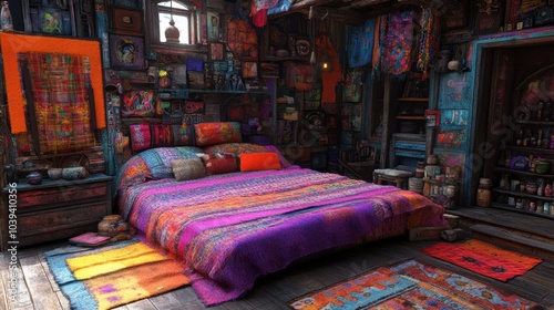 Bohemian Bedroom Interior Design with Colorful Bedspread and Rugs