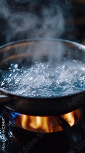 boiling, water, pot, stove, gas, flames, steam, kitchen, cooking, heat, stainless, steel, dark, blue, bubble, hot, closeup, food, liquid, metal, vessel, surface, energy, bright, clean, domestic, indoor, nobody, motion, vapour, culinary, preparation, refreshment, simmer, temperature, warmth, gastronomy, ingredient, nourishment, simple, transparent, freshness, purity, clear, dynamic, vibrant, energetic