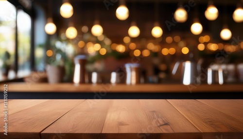 Bokeh Barista Haven Empty Wooden Table Amidst a Swirl of Coffee Shop Ambiance, Perfect for Product Placement and Design Inspiration