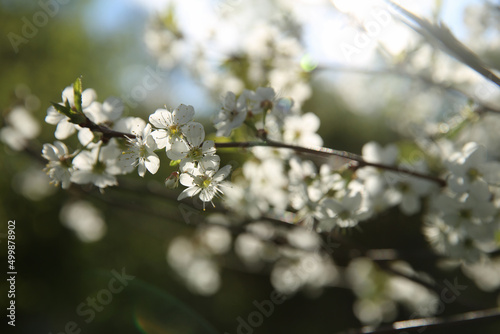Bokeh flower Background. Cherry flowers on a branch in the backlight. Spring background