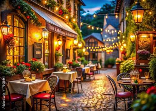 Bokeh lights illuminate a charming village restaurant at night, serving delicious food.