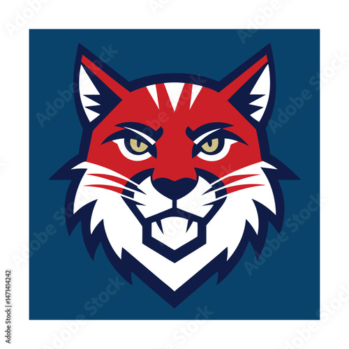 bobcat, wildcat, mascot, sport, team, logotype, emblem, head, face, animal, felino, predator, graphic, design, illustration, vector, art, modern, red, blue, white, sharp, aggressive, fierce, strong, bold, university, college, high school, character, claw, teeth
