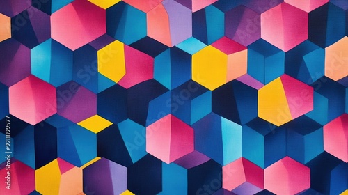 Bold and vibrant geometric pattern featuring repeating pentagons in colorful shades of pink, blue, yellow, and purple