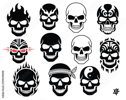 Bold Black and White Tribal Skulls with Decorative Patterns and Flames