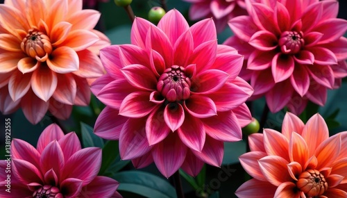 Bold dahlia petals, repeating design, rich color palette, flowers, wallpaper, print