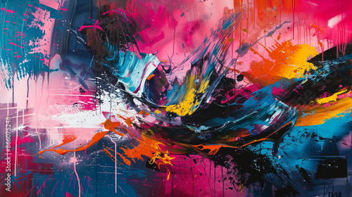 Bold, energetic compositions that combine expressive brushwork with elements of graffiti or street art, using vibrant colors and layered textures to convey contemporary themes.