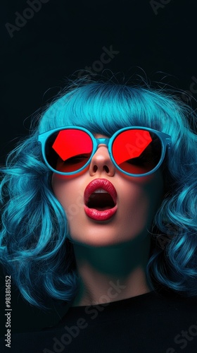 model, fashion, sunglasses, red lips, portrait, beauty, vibrant, dramatic, studio, contrast, expression, make-up, glam, stylish, colours, trendy, lifestyle, chic, youthful, bold, accessory, head shot, bright, design, playful, artistic, closeup, female, personality, glamour, aesthetic, modern, attitude, emotion, striking, fun, character, vibe, look, individual, unique, radiant