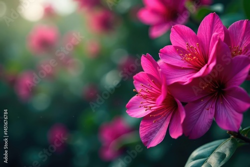 Bold fuchsia blossoms, densely packed, vibrant design, purple, leaves