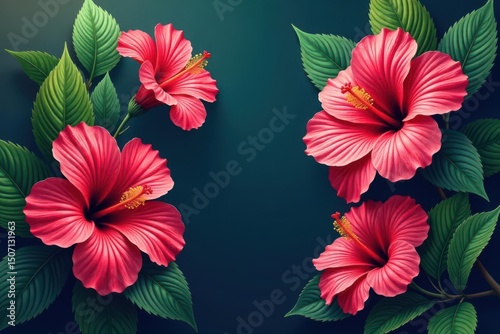Bold, graphic hibiscus blossoms, lush leaves, tropical feel, textile, yellow