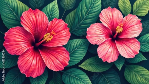 Bold hibiscus & tropical leaves, vibrant color block print, textile, bloom, exotic flowers
