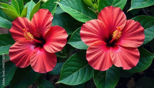 Bold hibiscus flowers, repeating design, lush green foliage , flora, repeat, art