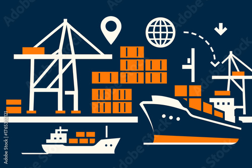 vector, icon, container, route, digital, crane, tracking, bold, design, shape, minimal, port, minimalism, geometric, dock, colours, high, icon, stacked, ship, clean, container, flat, cargo, arrow, illustration, shipping