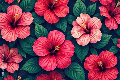 Bold repeating hibiscus pattern, vibrant colors , seamless, bold, red