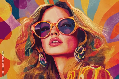 Bold retro patterns in a stylish portrait, 70s-inspired with modern color pop and a chic, vibrant look