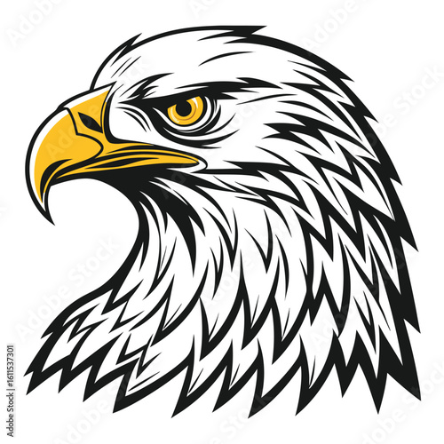 Bold Stylized Eagle Head Illustration in Profile with Graphic Feather Detail on White Background