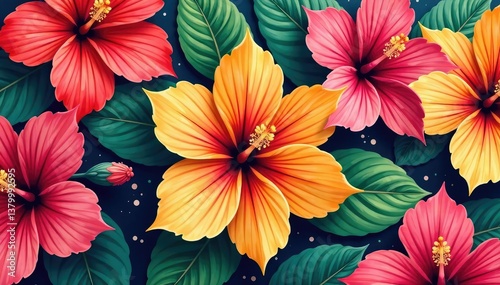 Bold tropical hibiscus blooms, vibrant repeat , design, background