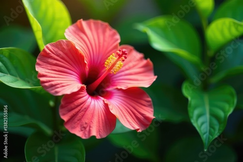 Bold tropical hibiscus, lush green leaves, vibrant color explosion, art, hawaiian, design