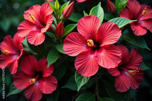 Bold, vibrant hibiscus blooms in a tropical, densely packed arrangement , design, wallpaper, red