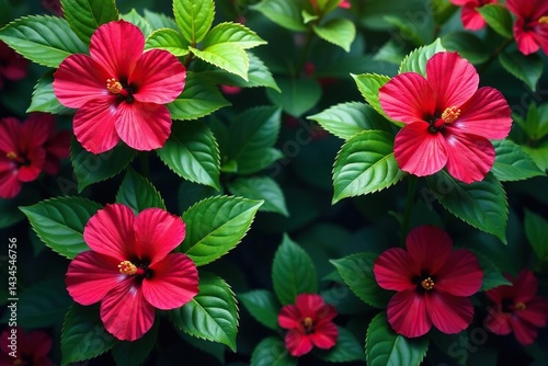Bold, vibrant hibiscus repeat across lush green foliage, art, floral