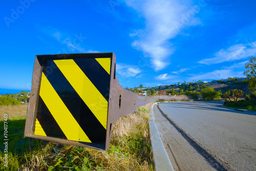 Bold yellow and black stripes mark the ends of a highway guardrail