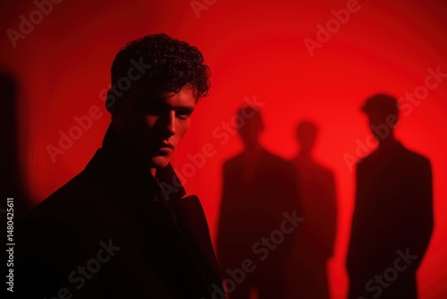 fashion, designer, male, photogenic, crimson, shadow, silhouette, mystery, bold, editorial, photo, moody, red, dramatic, model, atmosphere, intrigue, suit, powerful, aesthetic, depth, expression, confident, concept, black, studio, emotion, figure, menswear, styling, contemporary, contrast, artistic, minimal, attitude, cinematic, sharp, elegance, pose