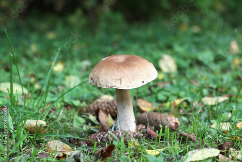Boletus edulis (king bolete, porcini mushroom) in the forest. Selective focus.