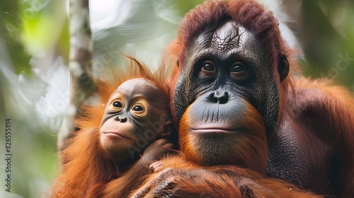 Bond of Bornean Orangutan Mother and Infant in Lush Rainforest