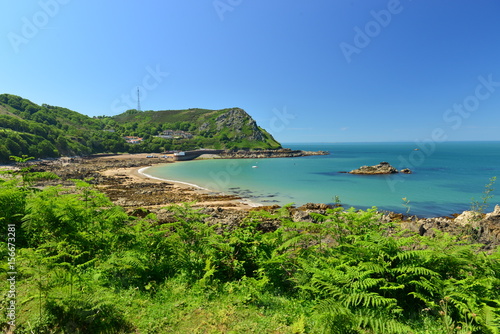 coast, sea, harbor, island, jersey, britain, beach, nature, landscape, tour tourism, travel, destination, idylli, calm, holiday, fern, teal, headland, sky, blue, fisheye, nobody, lush, summer
