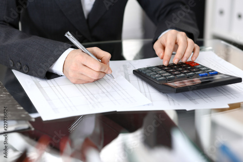 Bookkeeper woman or financial inspector making report, calculating or checking balance, close-up. Business portrait. Copy space area for audit or tax concepts