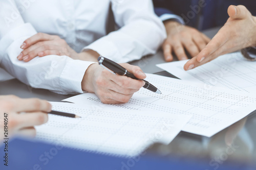 Bookkeepers team or financial inspectors making report, calculating or checking balance. Group of people at work. Business operations concept